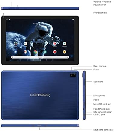 Enjoy compact convenience with the perfectly portable CT201 tablet. Work, watch, and play your favorite games and movies on a sizable 10″ screen backed by the easy-to-navigate Android 11 operating system. Includes CT201 tablet with AC adapter, USB charging cable, folio keyboard Android 11 operating system Quad-core processor 10″ diagonal Full HD display with 1920×1080 resolution; IPS technology 4GB RAM 64GB Storage 802.11a/b/g/n/ac Wi-Fi 2-megapixel front-facing camera 5-megapixel rear-facing camera with flash USB-C port microSD memory card slot 3.5mm headphone jack Measures approximately 9.84″W x 0.37″D x 6.3″H; 1.22 lbs What You Get *Compaq 10″ tablet *Power adapter *USB-C charging cable *Folio keyboard *Detachable kickstand *Manufacturer’s 1-year limited warranty