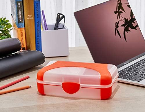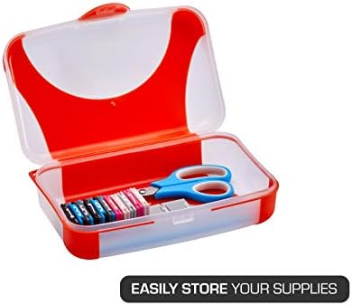 Plastic pencil box with hinged lid that snaps in place to secure school and craft supplies
