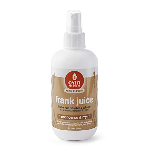 Oyin Handmade frank juice nourishing herbal leave-in hair tonic, nourishing herbal leave-in hair tonic. No animal testing, mineral oils or parabens. This Frankincense & Myrrh scented, oil-free, nourishing herbal leave-in blends vegetable moisturizers and herbal essences to feed hair and scalp like a salad! It softens loose hair to ease detangling, and a quick spritz helps refresh thirsty locks, twists, or braids. Humectants help hair draw moisture from the air.