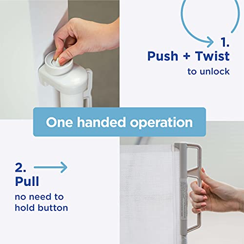 ONE HANDED OPERATION: The simple 2-step operation allows you to open and close while holding your child: 1. Push, twist and release button; 2. Pull the handle to extend the gate, when the handle is released, gate automatically locks the release mechanism