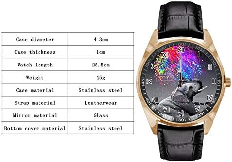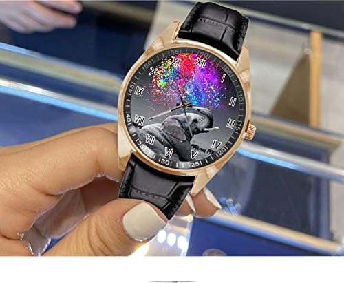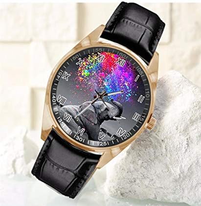 Women watches Material: gold stainless steel case, mineral crystal, high quality quartz movement imported from Japan, black leather strap. Face of watch with fashion image Animal Elephant Watercolor Spray Rainbow. Look Great. Women and Men love this watch. Easy read dial and easy to clean.